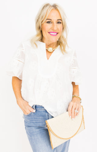 Meet your new go-to: the Luna Breeze Top by JOYJOY. With its breezy silhouette and soft, airy fabric, this blouse captures the essence of effortless charm. Featuring a relaxed fit, fluttery sleeves, and a subtle print that feels like a moonlit evening, it’s equal parts romantic and versatile. Pair it with denim or flowy skirts for a look that’s light, lovely, and totally timeless.